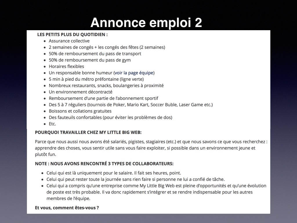 Au Québec, c’est le contraire, on essaie de vous séduire : les avantages sociaux sont mis en avant dans les annonces d’emploi et lors des entrevues. Voici 2 exemples d’annonces d’emploi pour saisir la différence.