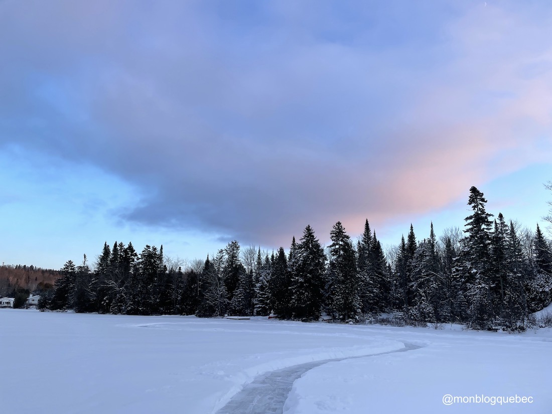 Cet hiver, nous avons créé une patinoire privée sur le lac gelé, devant le chalet. Une aréna pour jouer au hockey et un anneau de glace pour faire plus de distance. Bien sûr, c’est toujours difficile de croire que la glace va tenir. Mais avec le froid extrême de l’hiver, j’ai constaté que la glace était vraiment épaisse. Et beaucoup de québécois ont fait de même sur ce lac. Au final, quel bonheur pour les enfants.