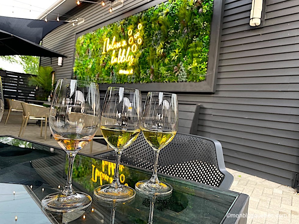 Nous avons choisi la dégustation de 3 verres pour 15$. Malgré le manque d’organisation du personnel, nous avons pu prendre place au bar, joliment décoré. Le choix est varié : brut rosé, vin blanc, rosé ou rouge.