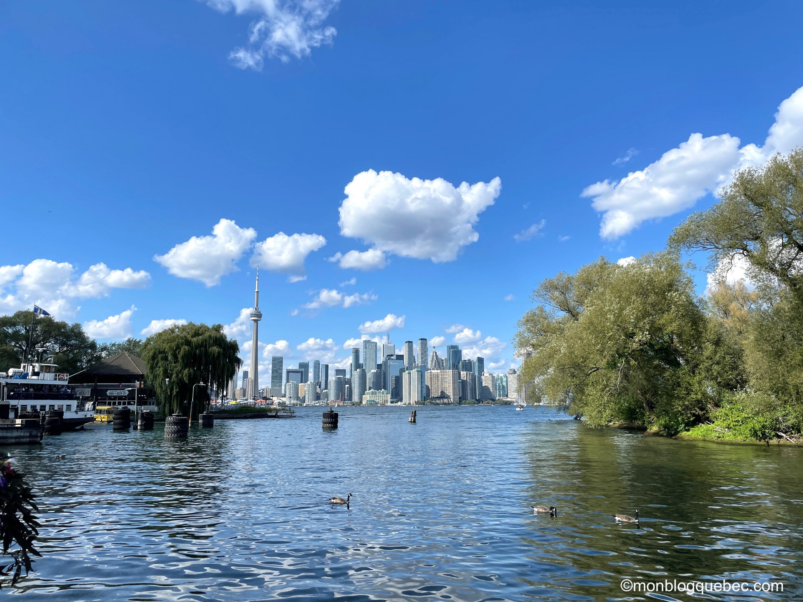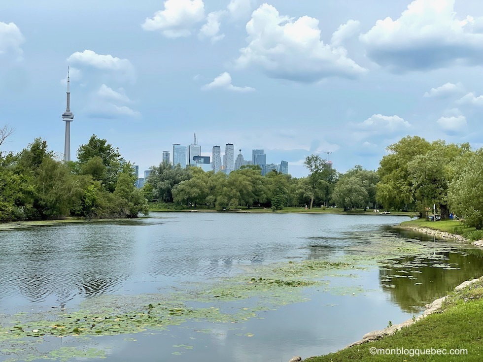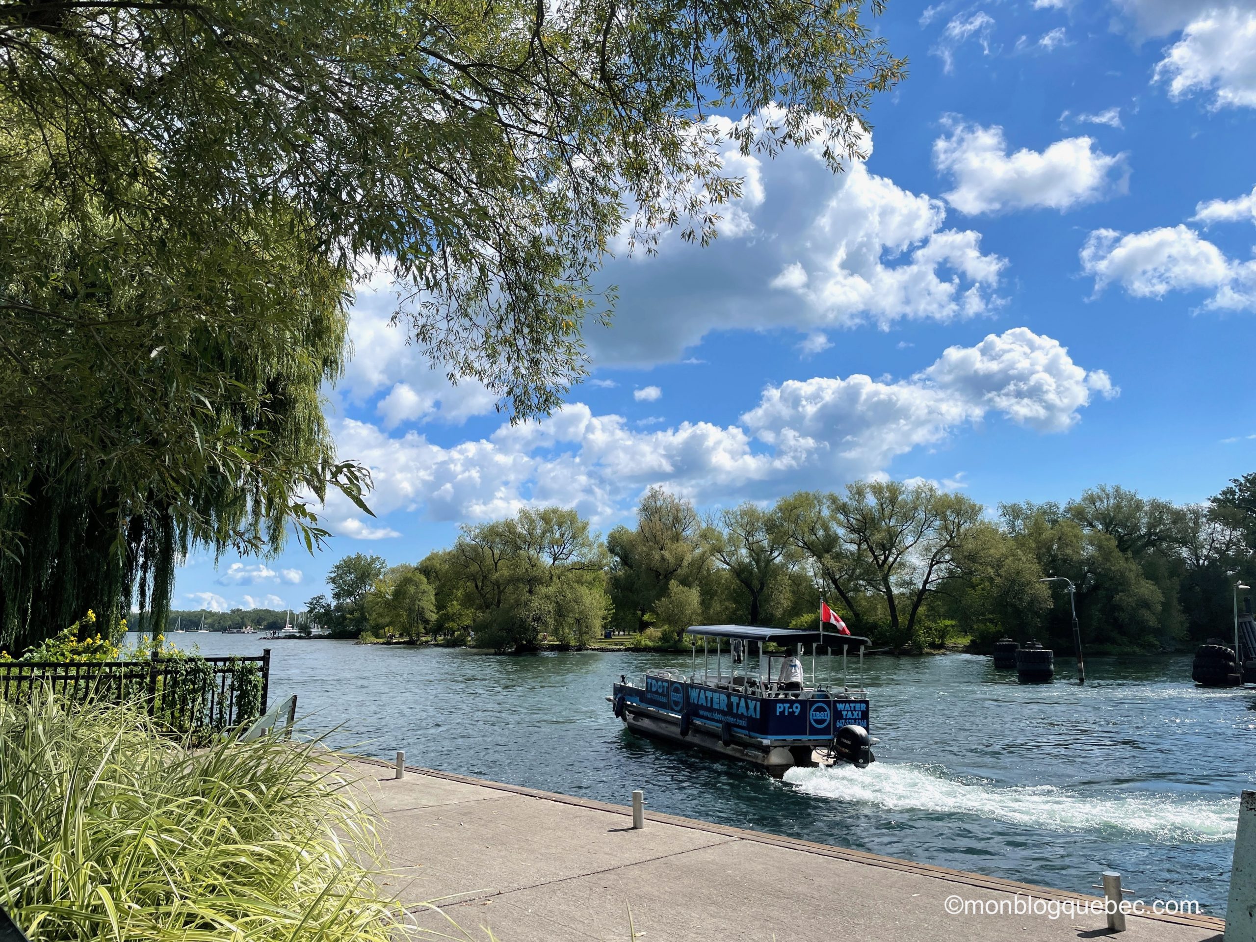 Les îles de Toronto, ou Toronto Islands, sont un archipel comptant 15 petites îles situées à 1,6 km au sud du centre-ville de Toronto, sur le lac Ontario. Pour s’y rendre, il faut prendre le bateau. Tu as le choix entre le ferry ou les nombreux taxis bateaux. Le prix diffère bien sûr, mais pas besoin d’attendre pour le taxi. Nous avons opté pour le taxi avec un prix de 20$ aller-retour / personne. Un ponton flottant avec 4 chaises de jardin double en rotin dessus, un pilote joyeux avec sa musique à fond et nous voilà en quelques minutes à peine sur le parc des îles de Toronto.