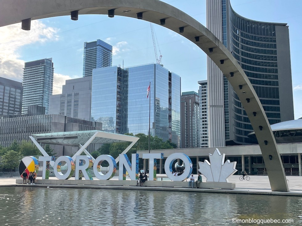 Il est célèbre pour ses grandes arches surplombant un bassin rectangulaire avec jets d’eau et les lettres «TORONTO» illuminées de diverses couleurs la nuit venue. C’est une belle place pour les photos de jour comme de nuit, mais aussi pour admirer la tour de l’horloge du vieil hôtel de ville juste à côté. Elle est très dynamique et accueille de nombreux évènements.