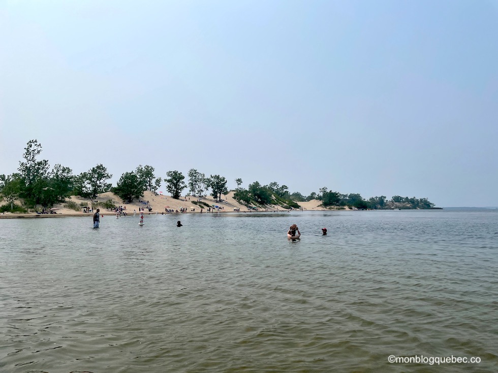 Ayant déjà visité la plage Lakeshore, la + longue plage du parc, nous choisissons de découvrir la plage des dunes. Contrairement aux autres plages qui donnent sur le lac Ontario, celle-ci se situe sur West Lake. En fait, c’est la + importante formation de dunes d’eau douce au monde. Et quelle surprise : les dunes sont véritablement magnifiques. Le sable est blanc, doux et très fin. Les eaux sont moins vertes que dans mon souvenir (de l’autre côté), mais elles sont cristallines et peu profondes. Chaudes, elles permettent la baignade tôt dans la saison.