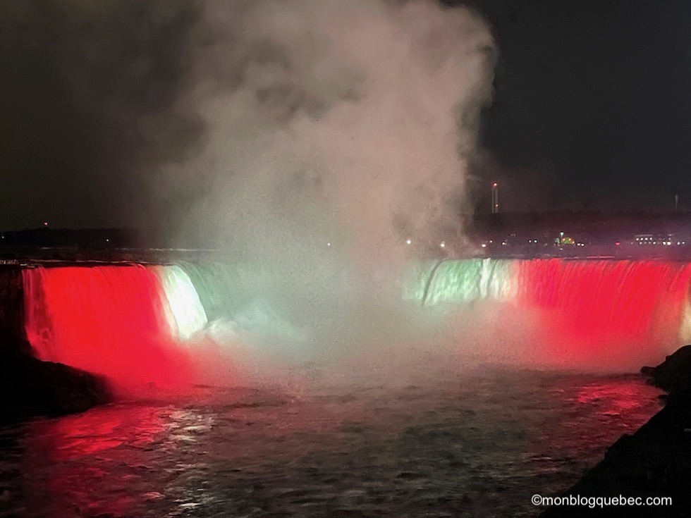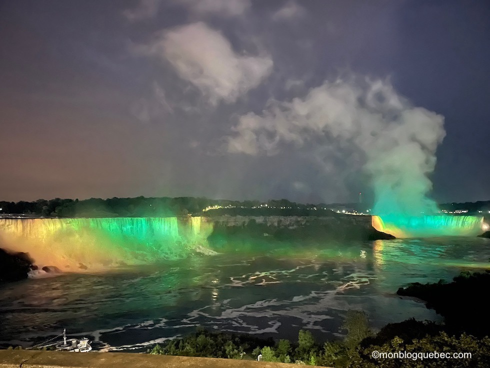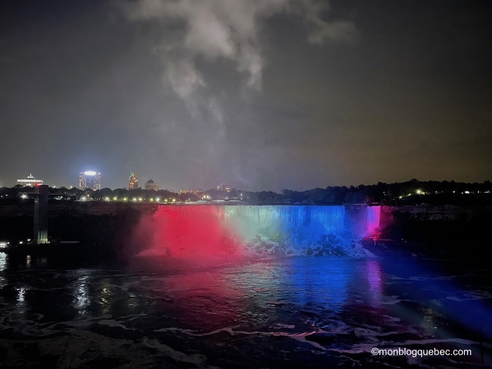 Les chutes du Niagara, un ensemble de 3 chutes d’eau situées sur la rivière Niagara, relient le lac Érié au lac Ontario, dans l’est de l’Amérique du Nord, à la frontière entre le Canada et les États-Unis. Leur originalité est leur forme de fer à cheval et leur largeur. Elles sont vraiment impressionnantes. Quel spectacle ! Je suis très heureuse de cette visite imprévue : la vue est tellement différente de nuit. Des jeux de lumières incroyables mettent en valeur les chutes : couleurs du drapeau pour chaque côté des chutes ou couleurs thématiques. Rien ne peut mieux décrire ce spectacle que quelques photos, non ?