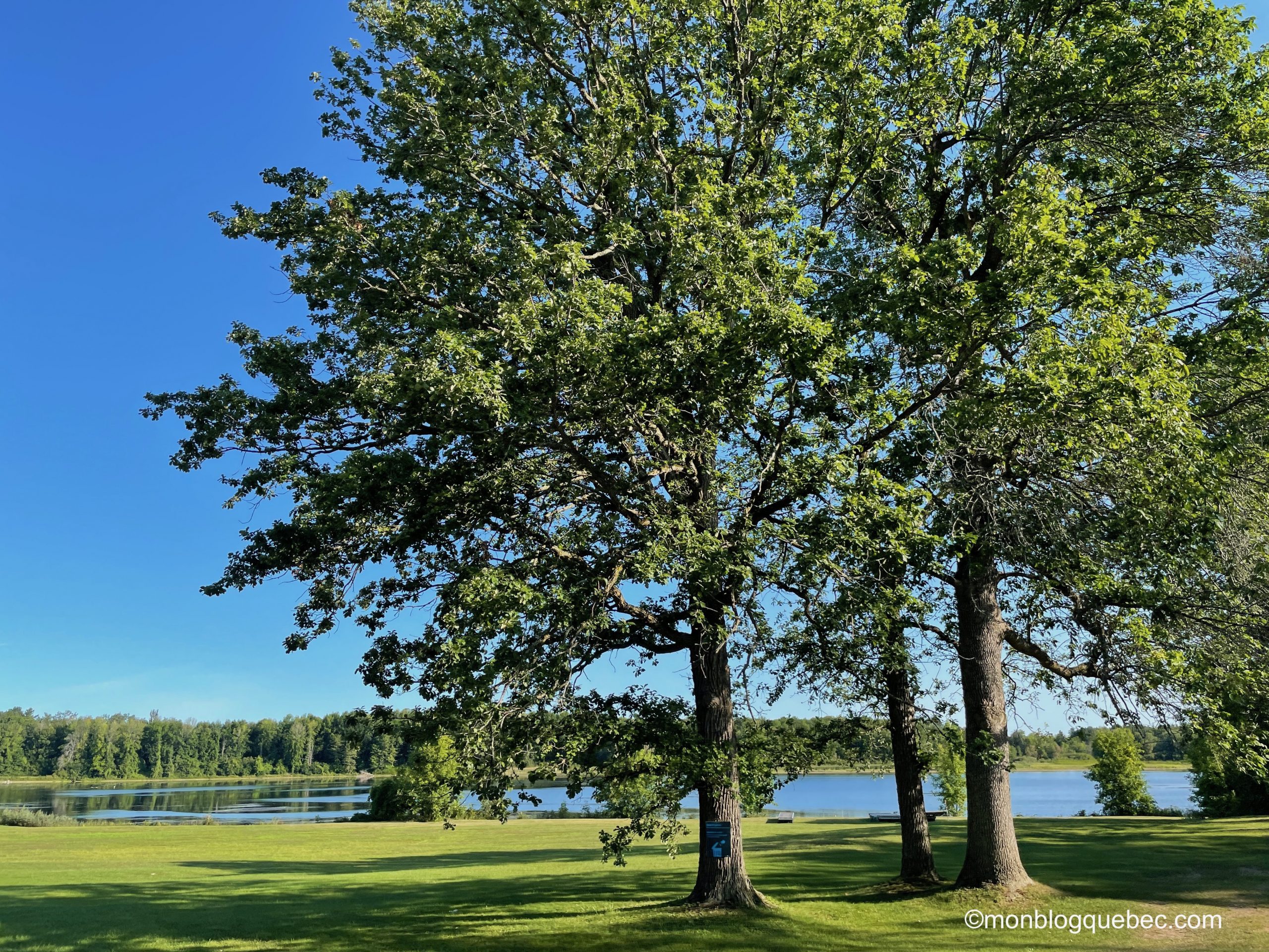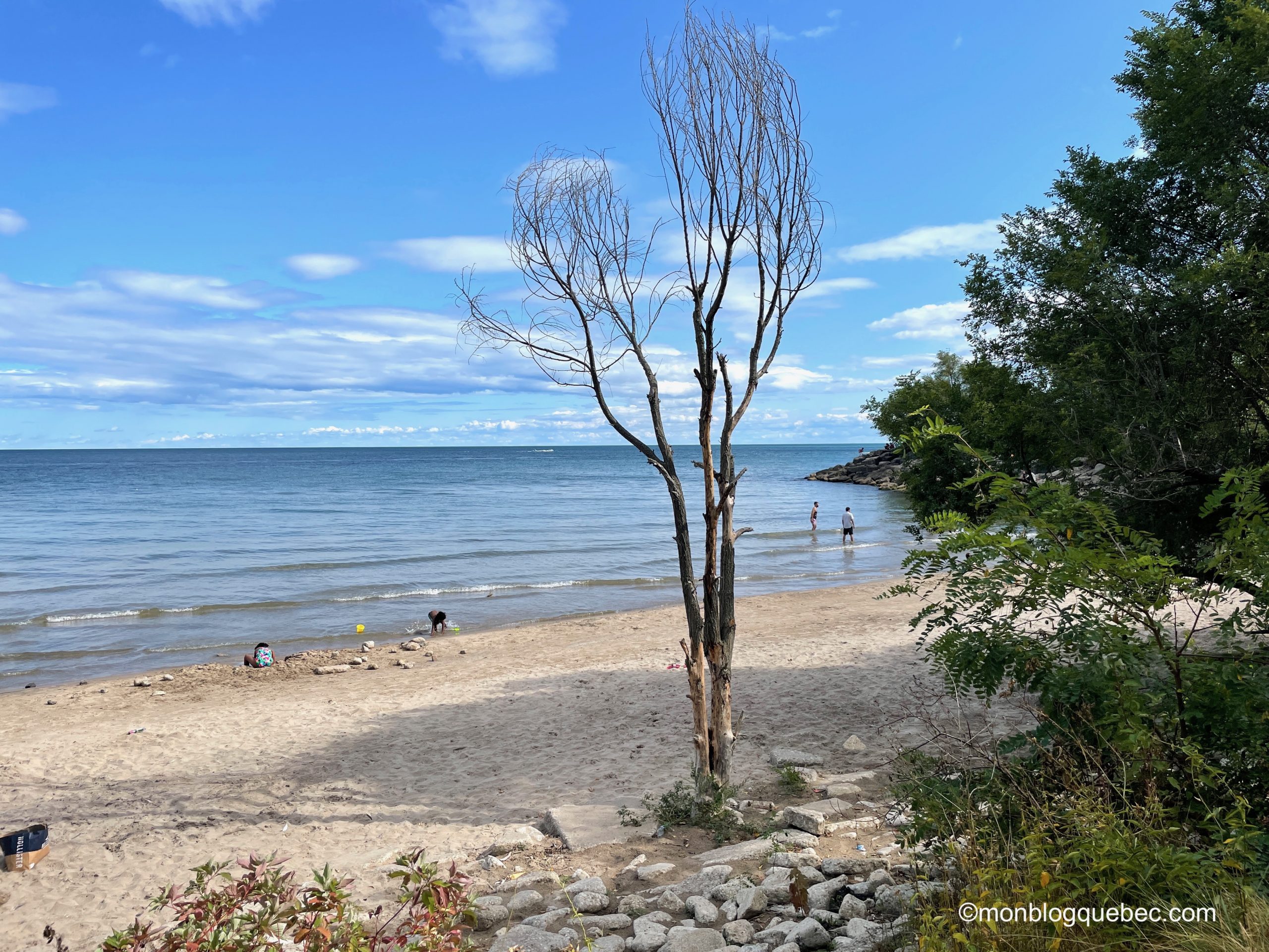 Toutefois, derrière la jetée en pierres, nous avons découvert une petite crique peu achalandée. Le décor est sublime. Des arbres morts lui donnent même des airs des Caraïbes. Pourtant le spectacle des jet-skis à l’horizon nous rappelle beaucoup Cavalaire-sur-Mer. En fait, les ontariens et touristes sont plutôt sur les pelouses, avec les barbecues et jeux de plein air pour profiter de joyeux moments en groupe. Ce qui nous laisse la plage déserte !